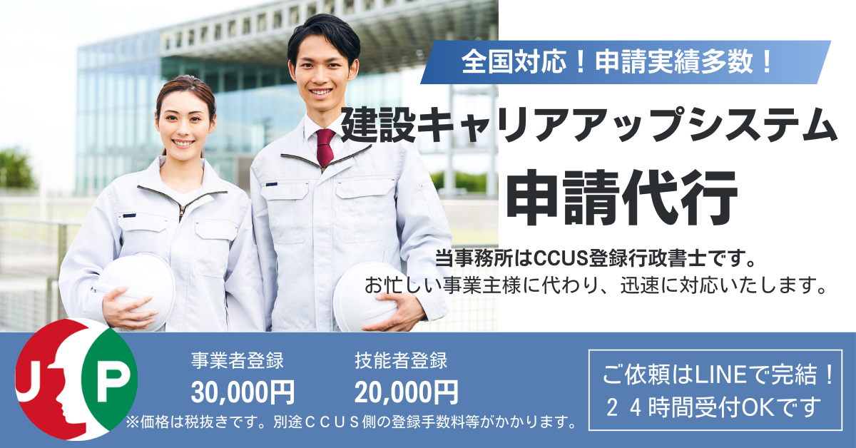 当事務所はCCUS登録行政書士です。 CCUS登録行政書士とはCCUSに事業者登録し、CCUS登録(新規変更)希望者の代行申請を行うことができる行政書士のことです。