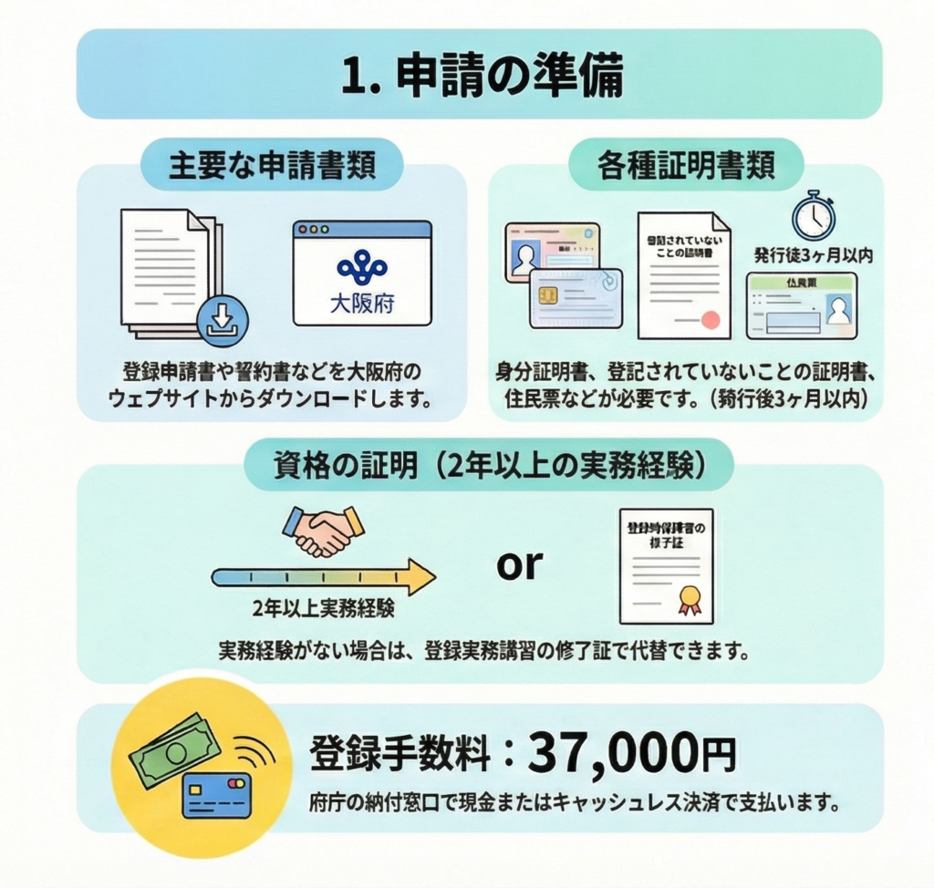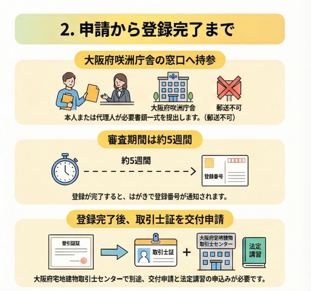 宅地建物取引士証の交付は、登録完了後に(一財)大阪府宅地建物取引士センターへ申請します。